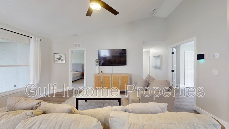 The spacious master bedroom includes its own private bathroom and an oversized walk-in closet. Two additional bedrooms provide plenty of space for family or guests. One of the bedrooms features elegant glass French doors, making it perfect for use as a dedicated home office or flexible bonus space. The oversized living room is filled with natural light, flowing effortlessly through large glass windows that overlook a generous backyard—ideal for creating your own private oasis with space for a pool, outdoor kitchen, or patio. The open-concept kitchen includes laminated countertops, a walk-in pantry, abundant cabinet storage, and a spacious dining area—perfect for entertaining and group gatherings. Additional features include: an attached 2-car garage, Full-sized washer and dryer, electric stove, refrigerator, microwave, dishwasher, and more.